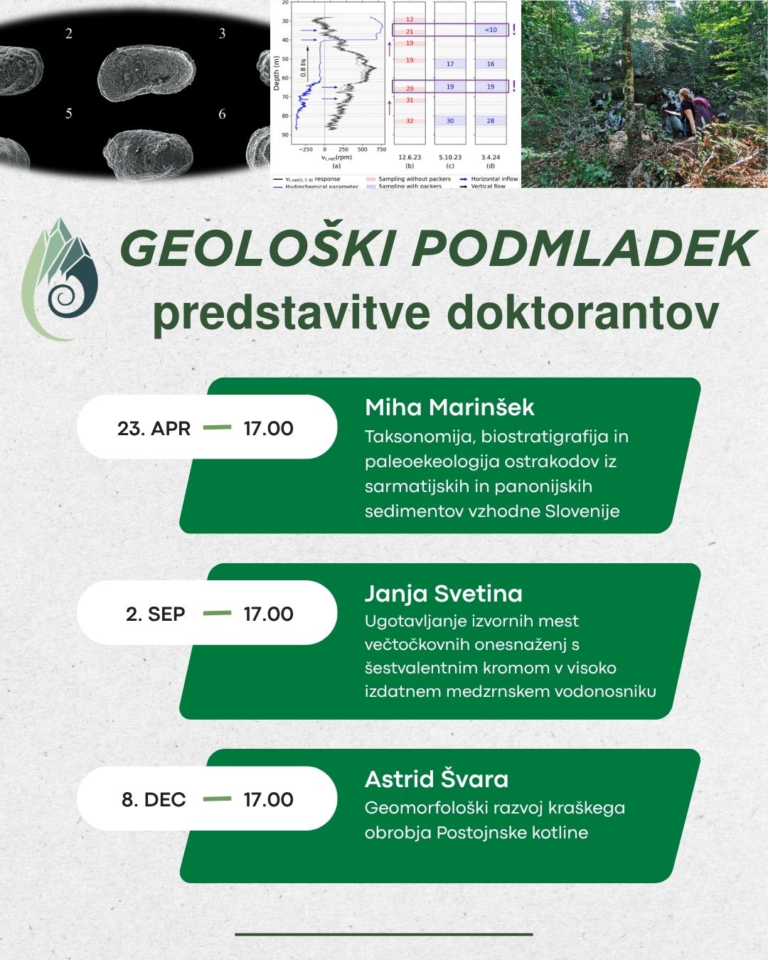 𝗱𝗿. 𝗠𝗶𝗵𝗮 𝗠𝗮𝗿𝗶𝗻š𝗲𝗸, Geološki zavod Slovenije – Oddelek Regionalna geologija, je pod mentorstvom doc. dr. Luke Galeta (NTF – Oddelek za geologijo) doktoriral 23. 12. 2025 na Univerza v Ljubljani / University of Ljubljana. Svoje delo z naslovom 𝗧𝗮𝗸𝘀𝗼𝗻𝗼𝗺𝗶𝗷𝗮, 𝗯𝗶𝗼𝘀𝘁𝗿𝗮𝘁𝗶𝗴𝗿𝗮𝗳𝗶𝗷𝗮 𝗶𝗻 𝗽𝗮𝗹𝗲𝗼𝗲𝗸𝗼𝗹𝗼𝗴𝗶𝗷𝗮 𝗼𝘀𝘁𝗿𝗮𝗸𝗼𝗱𝗼𝘃 𝗶𝘇 𝘀𝗮𝗿𝗺𝗮𝘁𝗶𝗷𝘀𝗸𝗶𝗵 𝗶𝗻 𝗽𝗮𝗻𝗼𝗻𝗶𝗷𝘀𝗸𝗶𝗵 𝘀𝗲𝗱𝗶𝗺𝗲𝗻𝘁𝗼𝘃 𝘃𝘇𝗵𝗼𝗱𝗻𝗲 𝗦𝗹𝗼𝘃𝗲𝗻𝗶𝗷𝗲 bo predstavil 23. 4. 2026 ob 17.00.